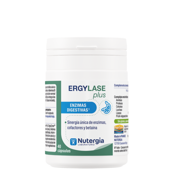Una sinergia única que combina betaína con un complejo de 6 enzimas de origen natural:lipasa (digestión de grasas)proteasa (digestión de proteínas)amilasa y celulasa (digestión de carbohidratos)lactasa (digestión de la lactosa)tolerase® G (descomposición del gluten)ERGYLASE Plus también contiene calcio, que contribuye al funcionamiento normal de las enzimas digestivas, y vitaminas B2 y B3, que ayudan a mantener la salud de las mucosas.
