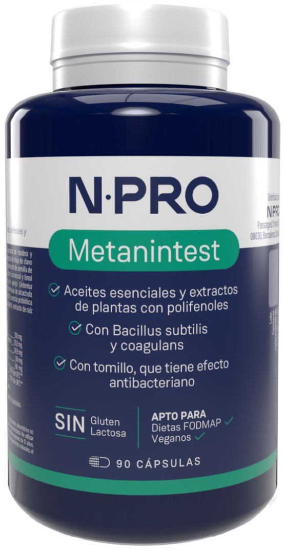 NPro Metanintest contiene una mezcla innovadora de extractos de plantas ricas en polifenoles, aceites aceites esenciales microencapsulados y cepas probióticas.