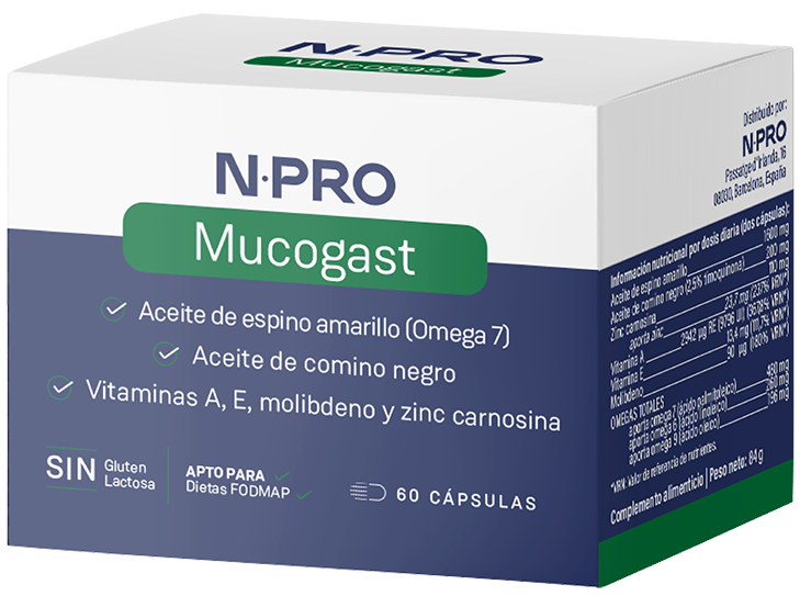 NPRO Mucogast combina aceites vegetales de espino amarillo y comino negro, ricos en ácidos grasos omega 3, 6, 7 y 9, junto con vitaminas y minerales que potencian su acción.