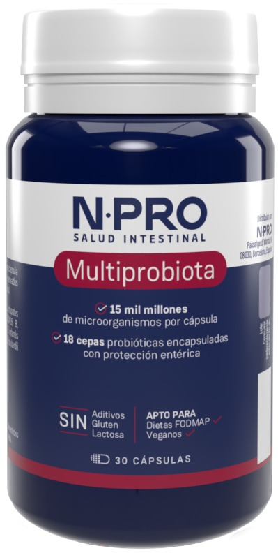 NPro Multiprobiota incluye 18 cepas bacterianas en una cápsula gastrorresistente, en una fórmula libre de derivados lácteos, carbohidratos y fibras prebióticas susceptibles de producir intolerancias y/o disconfort intestinal..