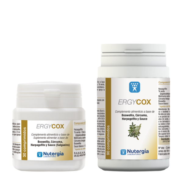 IngredientesExtracto seco de Harpagofito (Harpagophytum procumbens (Burch.) DC., 2% Harpagosidos), extracto seco de Té verde (Camellia sinensis (L.) Kuntze,95% polifenoles, 70% catequinas, 40% EGCG (Epigalocatequina-3-Galato), extracto seco de Matricaria camomilla, (Matricaria recutita L., 1% flavonas), extracto seco de Cúrcuma longa (Curcuma longa L., 50% curcuminoides), extracto seco de Boswellia (Boswellia serrata Roxb. Ex Colebr, 10% ácidos boswélicos (AKBA)) y extracto seco de Sauce blanco (Salix alba L., 25% salicina), Fibra de arroz (oryza sativa) y Antiaglomerantes: Estearato de magnesio.